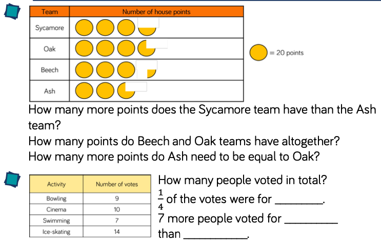 When looking at the second table, remember that to find 1/4 of the total number of votes, you will first need to add up all of the votes.