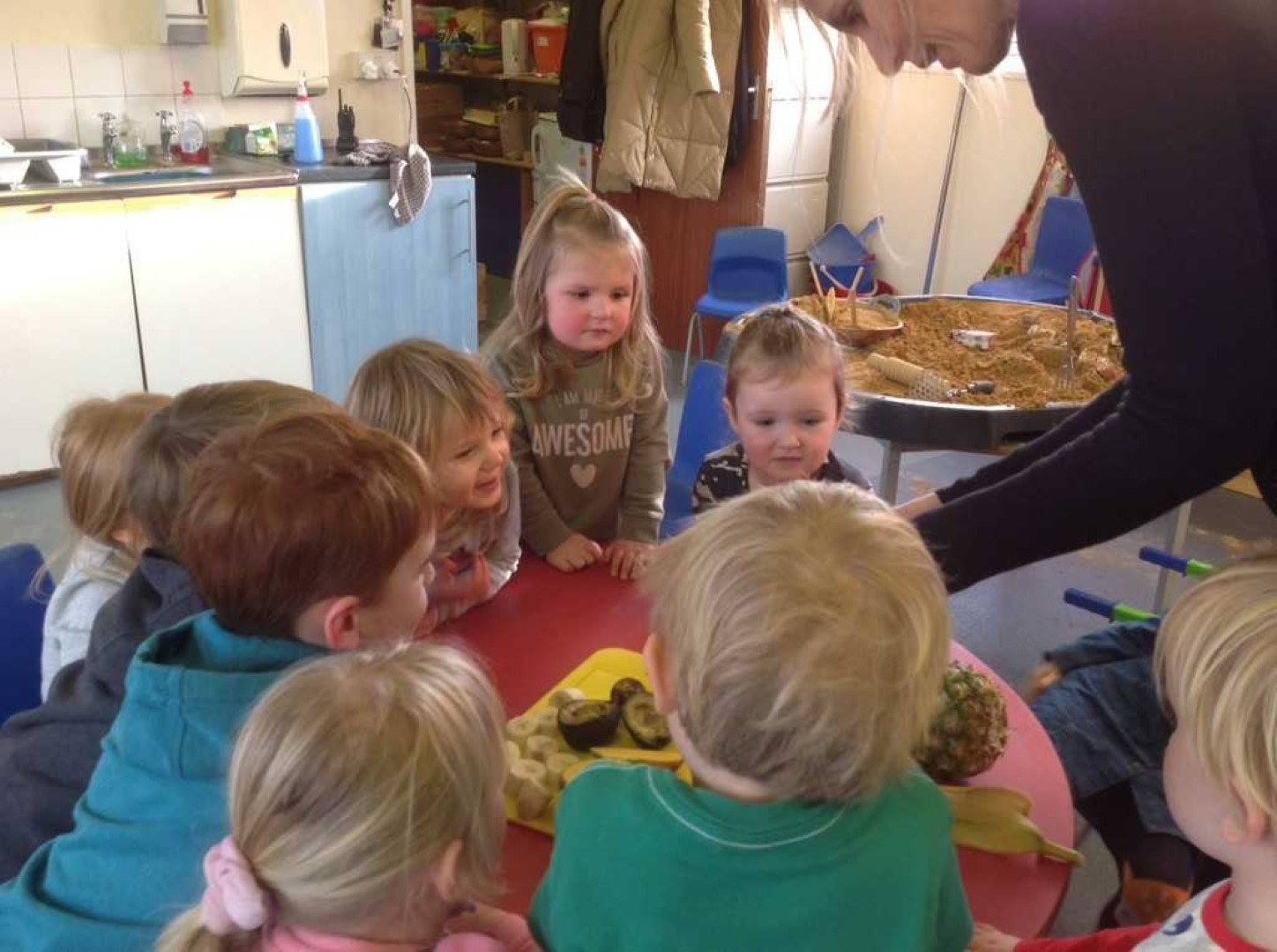 This morning we read Handa’s Surprise and looked at all of the fruits in our basket. Just before snack we took the basket of fruits to the table. Miss Idle took each one out and we looked at them to see if we could remember what they were called. We then had a guess of what colour the fruits may be inside. We passed each fruit around the circle to feel the texture and once Miss Idle had cut them in half we all smelt the fruits. After we had done that we had a taste of the delicious fruits at snack time. Today we tried banana, orange,passion fruit, pineapple, avocado, tangerines and mango. All of the children tried everything which was fantastic. We even had some empty plates and some children who asked for more!