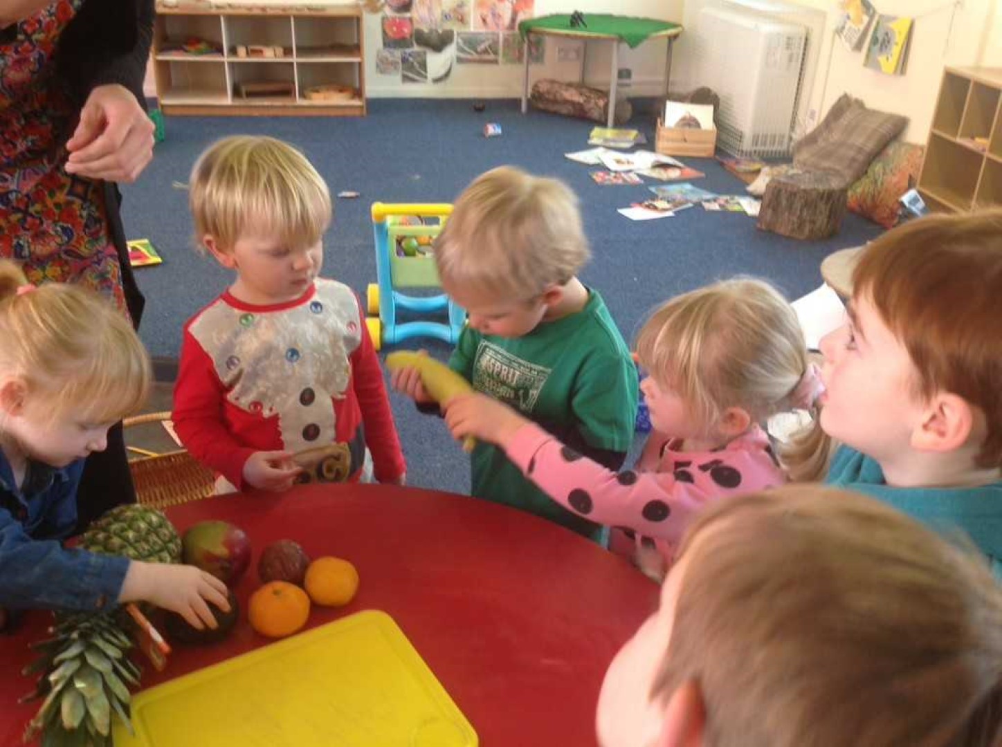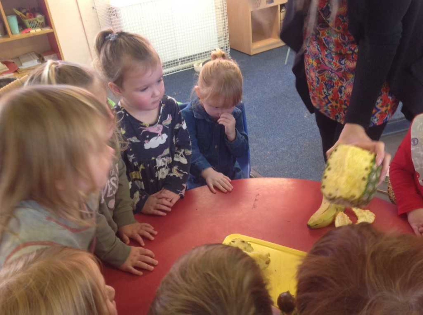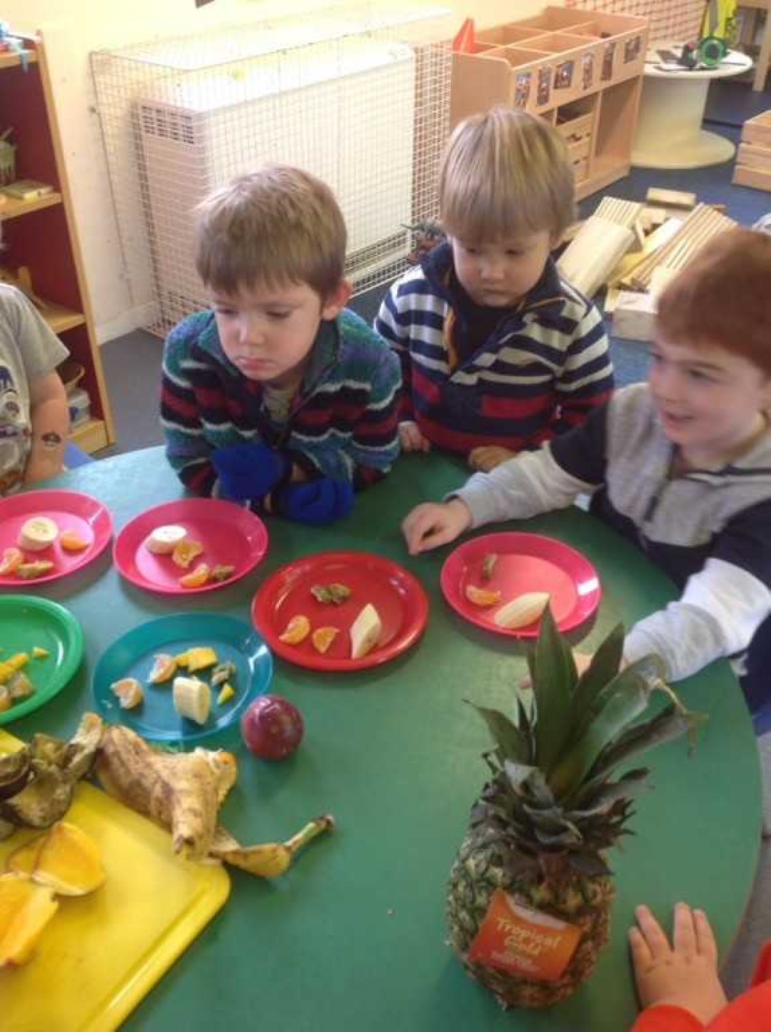 This morning we read Handa’s Surprise and looked at all of the fruits in our basket. Just before snack we took the basket of fruits to the table. Miss Idle took each one out and we looked at them to see if we could remember what they were called. We then had a guess of what colour the fruits may be inside. We passed each fruit around the circle to feel the texture and once Miss Idle had cut them in half we all smelt the fruits. After we had done that we had a taste of the delicious fruits at snack time. Today we tried banana, orange,passion fruit, pineapple, avocado, tangerines and mango. All of the children tried everything which was fantastic. We even had some empty plates and some children who asked for more!