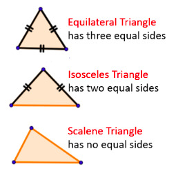 Try to draw two equilateral triangles (all sides are the same length), two isosceles triangles (two sides are the same length) and then two scalene triangles (no sides are the same length).