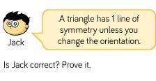 For the first question, Jack thinks that if he rotates his triangle, he will be able to find more than one line of symmetry. Do you agree with him?