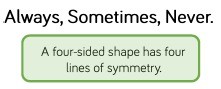 Looking at the second question, does a four sided shape always, sometimes or never have four lines of symmetry? Think about the quadrilaterals that you learned about last week to help you.